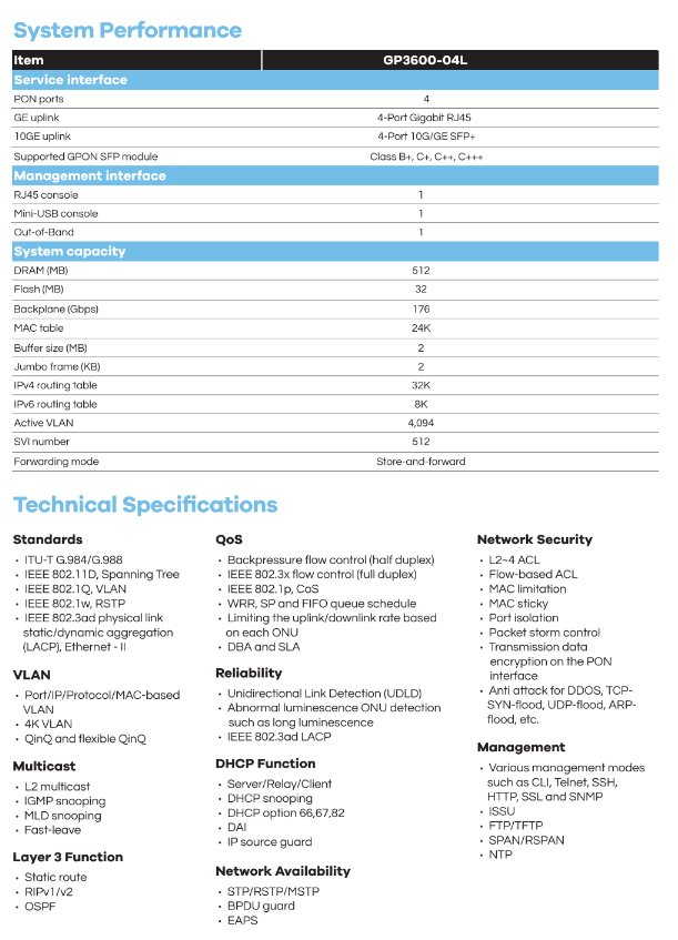 BDCOM GP3600-04L-AR je vybaveno 4x GPON porty, 4x GE RJ45 porty, 4x 10GE SFP+ porty, 1x konzolovým portem a 1x out-band portem. Podporuje asymetrický uplink 1.25 Gbps a downlink 2.5 Gbps PON přenosovou rychlost. Navíc má DC napájení (13.8 V / 2.5 A).Další informace