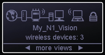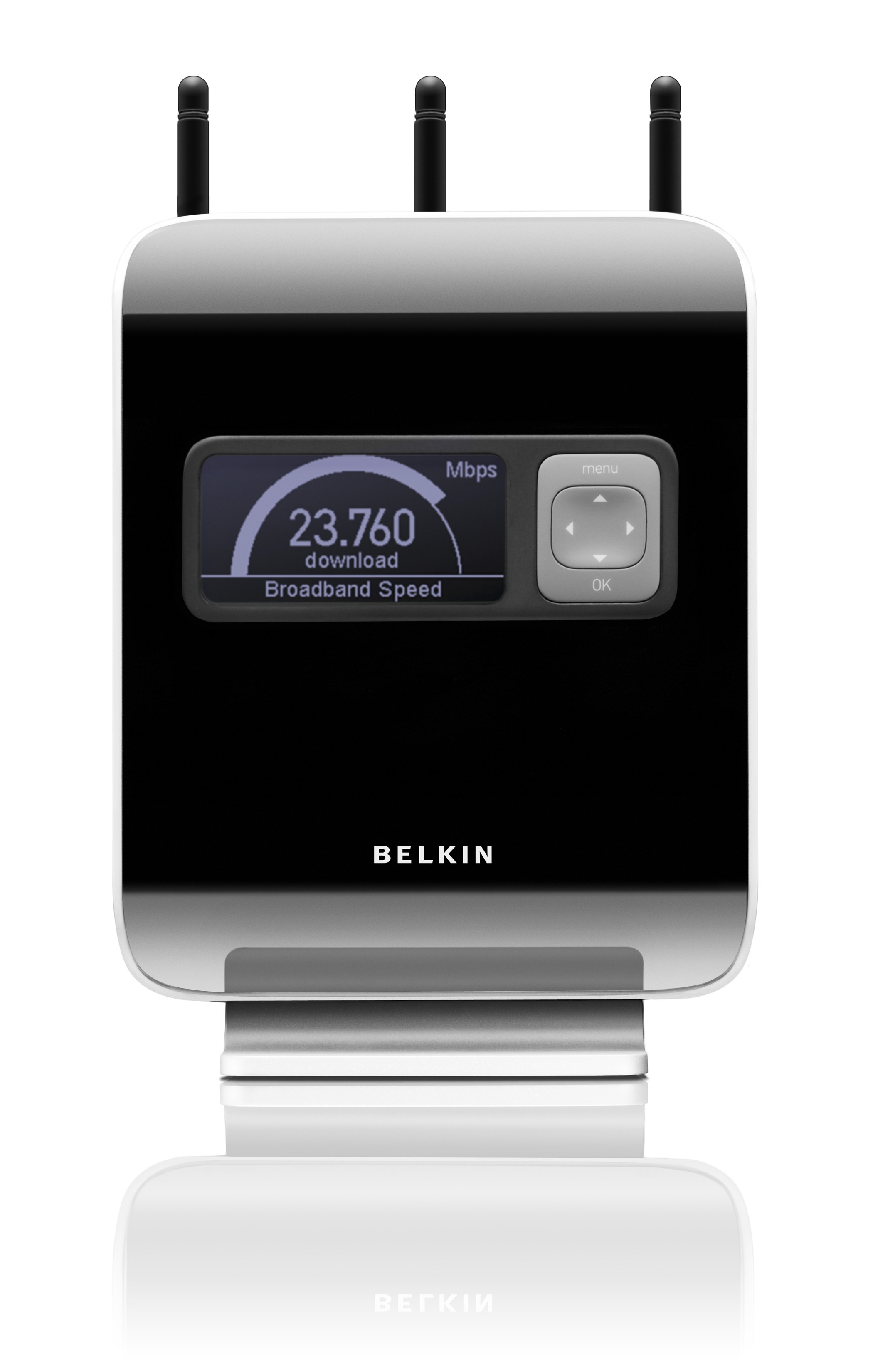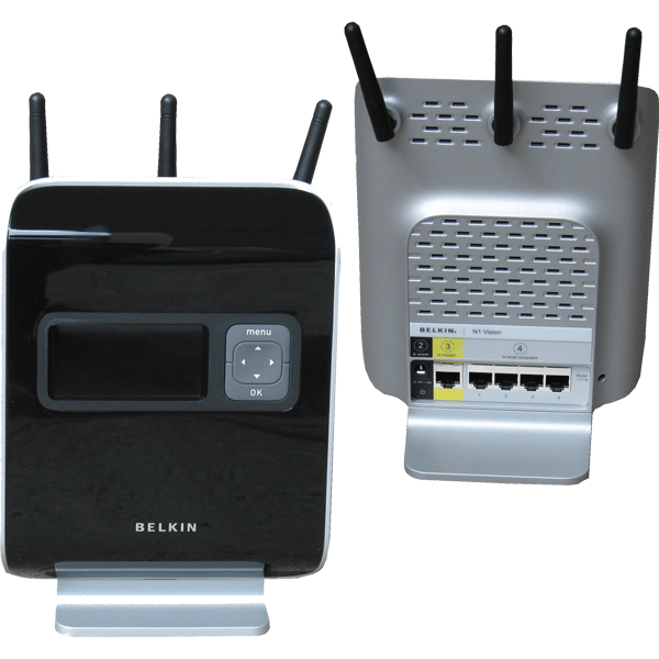 WiFi router Belkin N1 Vision, kompatibilní se standardem 802.11 b/g/n, integrovaný switch 4x10/100/1000Mbps. Jednotka disponuje přehledovým displejem který zobrazuje informace o jednotce.Další informace