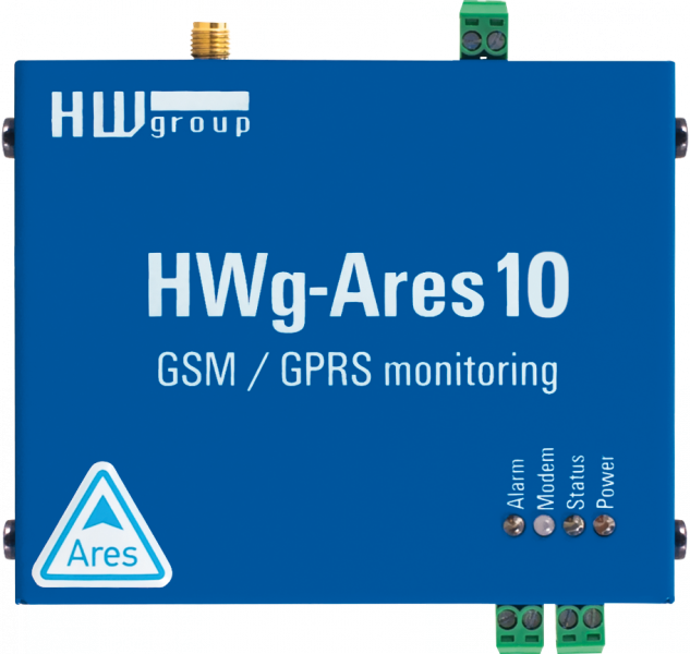 HWg-Ares10 je cenově efektivní GSM teploměr pro vzdálený dohled a odesílání poplachů z míst bez možnosti připojení k LAN, k němuž lze připojit až 6x senzor na 1 Wire a 1Wire-UNI a 2x detektor na DI. Přes on-line aplikaci HWPortal.cz lze HWg-Ares10 konfigurovat a ovládat, rozesílat alarmy či prohlížet grafy hodnot. HWg-Ares10 hlídá rozsahy hodnot připojených senzorů, při alarmové hodnotě posílá e-mail, SMS nebo prozvoní zadaná telefonní čísla. Produkty řady Ares umožňují vzdálenou aktualizaci firmware „FOTA“ (Firmware Over The Air).