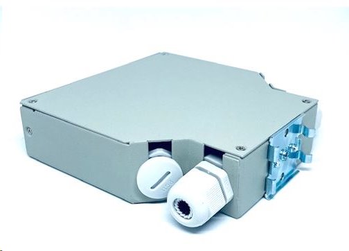 Optický rozvaděč/box pro umístnění na DIN lištu šedé barvy pro max. 8 SC simplex spojek, kovový se šroubovatelným víkem pro zakončení max. 12 optických vláken. Box má 4 kabelové vstupy a dodává se se 2 kabelovými průchodkami PG11 a dvěma záslepkami. Neosazen spojkami.