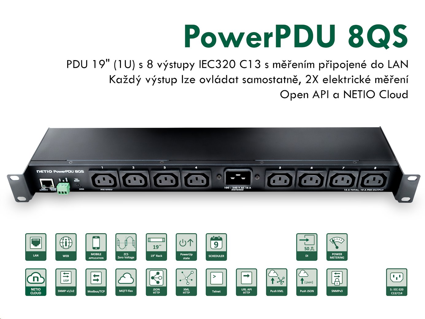 NETIO PowerPDU 8QS je chytré PDU (Power Distribution Unit) s osmi výstupy napájení (8x IEC-320 C13). Každý výstup lze vypnout a zapnout samostatně. PowerPDU 8QS podporuje elektrické měření na dvou kanálech – pro celé PDU (všechny výstupy dohromady) a samostatně první výstup (All Outputs + 1). DI vstup může ovládat výstupy nebo čítat S0 impulsy (výstup z elektroměru).