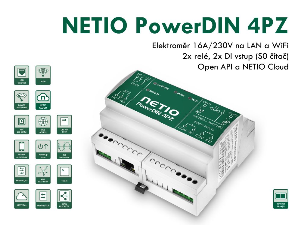 PowerDIN 4PZ je LAN/WiFi dvojitý elektroměr 230V/16A s I/O pro montáž na DIN lištu. Každý ze čtyř výstupů lze ovládat pomocí webového rozhraní a NETIO Cloudu prakticky odkudkoliv. Díky podpoře M2M protokolů není problém ani s integrací do stávajících systémů. Produkt je navržen i vyroben v České republice.