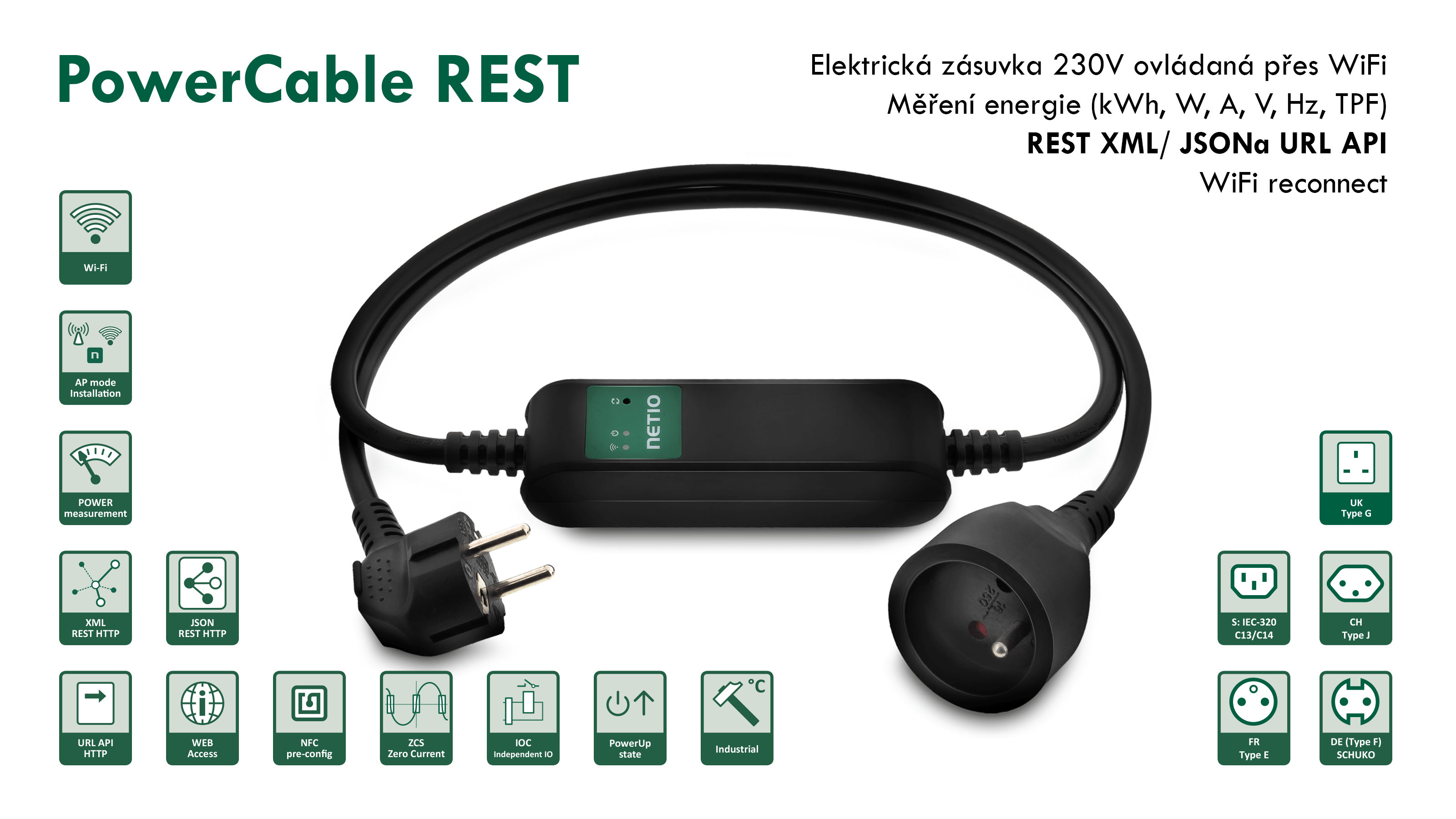 NETIO PowerCable REST 101E je WiFi zásuvka pro integraci do systému třetích stran pomocí otevřeného API. PowerCable je chytrá zásuvka v provedení jako elektrický prodlužovací kabel s WiFi připojením do LAN sítě. Přes web rozhraní lze zobrazit hodnoty měření spotřeby elektřiny a zapnout / vypnout výstupní elektrickou zásuvku.