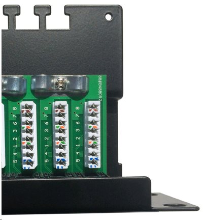 19" Patch panel určený pro montáž do 19" datových rozvaděčů. 3 x 8 pozic zářezového pole typu LSA (krone); 24 portů RJ45 cat.6; výška 1U; horní zářez; vyvazovací hřeben součástí patchpanelu; barva černáDalší informace