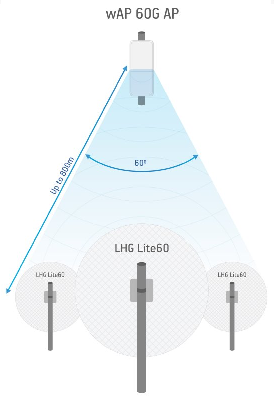 Připojte až 8 zařízení LHG Lite 60 do vzdálenosti 800 m v rozsahu 60° na přístupový bod wAP60G. Jedná se o skvělou alternativu zaplněných 2.4 a 5 GHz pásem.