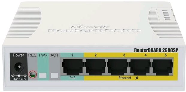 Tento model se liší od předchozího RB260GS možností napájet další zařízení na portech 2-5 pasivním PoE s maximálním proudem 500 mA / port.