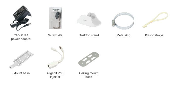 Jednotka je dodávána včetně licence úrovně L4, lze ji tedy využít jako přístupový bod. Součástí balení je adaptér (24 V/0,8 A), PoE injektor, držák na zeď/strop, stojánek na stůl, napájecí kabel pro použití v automobilech a drobný montážní materiál.