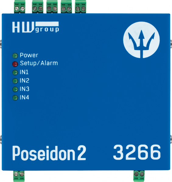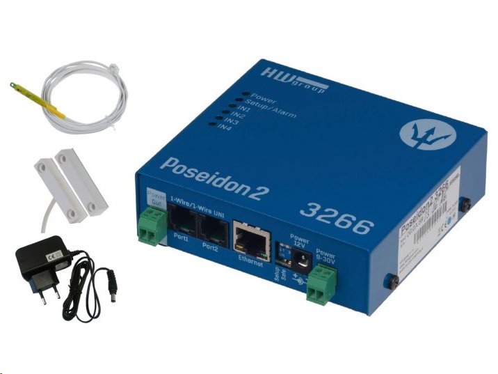 Poseidon2 3266 Vlhkostní a teplotní set obsahuje vše potřebné pro instalaci a zahájení dohledu a měření. Poseidon2 3266 měří teplotu, vlhkost , stavy kontaktů (DI vstupy) a jiných externích senzorů, odešle email při hodnotě mimo rozsah. Poseidon2 3266 lze připojit do systému pro monitoring prostředí. Podporuje M2M protokoly SNMP v3, Modbus/TCP, XML a online aplikace HWPortal.cz.