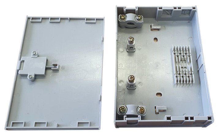 Nástěnný optický box odbočný 4xSC/LCD/E2000 plastový; 2x kabelový vstup (možno na průchozí kabel) s fixací na tahové prvky; držák na 6ks ochran svárů; 4x otvor pro osazení spojek SC simplex (LC duplex, E2000) se záslepkou; výbava: -ochrany svárů 6ks; 2...Další informace