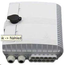Optický box pro 16 vláken. Dva vstupní porty; Parametry: Název; Hodnota; Výška (mm): 340; Šířka (mm): 260; Hloubka (mm): 90; Hmotnost (g): 1850; Materiál: PC;
