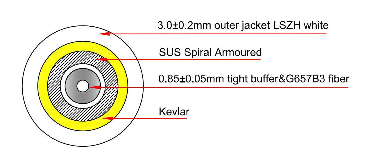 Plná průchodnost optického signálu je zajištěna i při ohybu do 5 mm, díky čemuž je možné kabelem kopírovat i rohy místností bez zbytečného útlumu. Předpokládané využití je tak v místech, kde se očekává méně šetrné zacházení, ale zároveň není možné z estetických důvodů použít další ochranu v podobě chráničky. Využití v domácnostech a kancelářích rovněž přispívají další vlastnosti těchto propojovacích kabelů - nenápadná bílá barva pláště, LSZH materiál a průměr 3 mm. Zvýšenou odolnost zajišťuje armování řešené spirálovitým opletem, který nesnižuje celkovou flexibilitu kabelu.