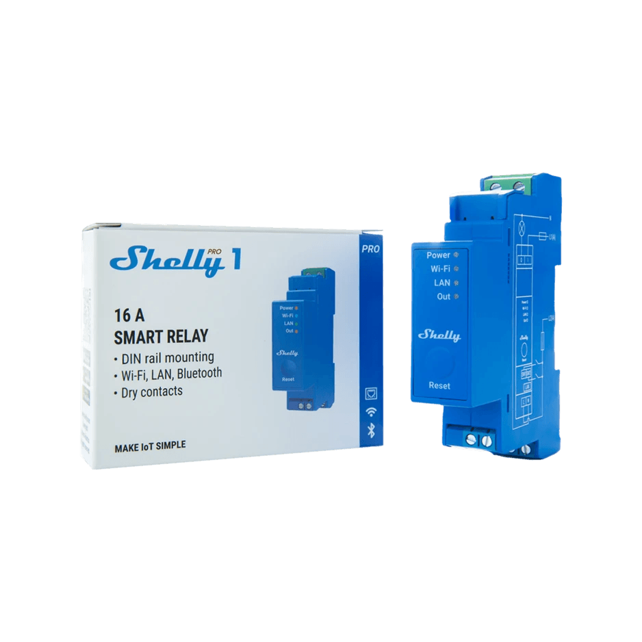 Shelly Pro 1 je 1kanálové relé podporující až 16 A pro profesionální automatizaci světel a spotřebičů v obytných nebo komerčních aplikacích. Je vybaven bezpotenciálovými výstupy (suché kontakty). Konektivita je řešena pomocí Wi-Fi (2.4GHz), LAN (RJ45) a Bluetooth. Shelly Pro 1 má skriptovací funkce (plná podpora mjS) pro vlastní automatizační scénáře založené na externích datech nebo různých událostech.