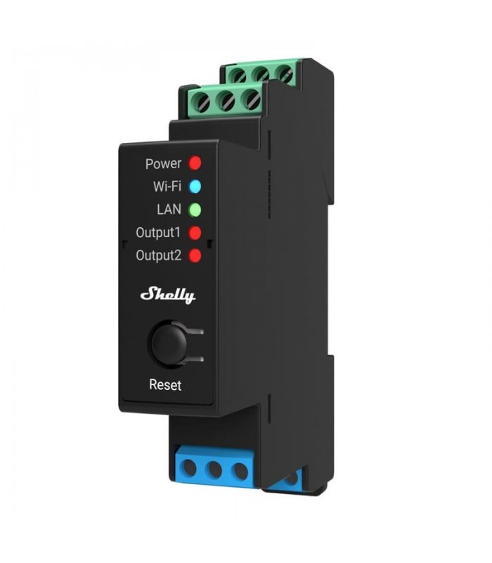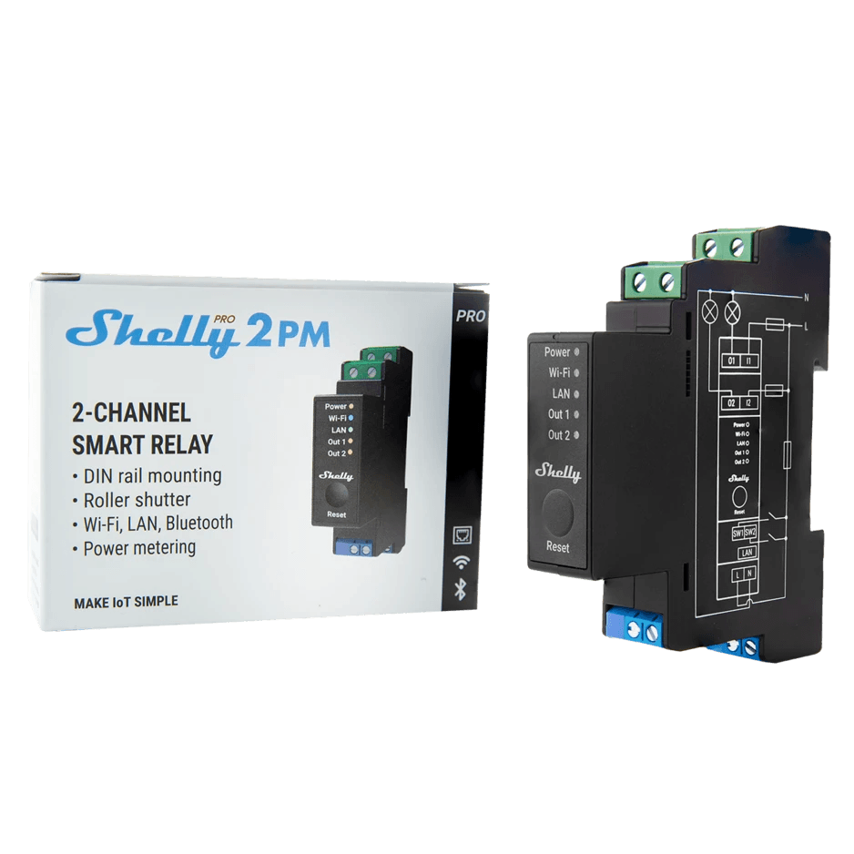 Shelly Pro 2PM je 2kanálové relé podporující až 25 A (každý 16 A) s měřením spotřeby pro profesionální automatizaci světel a spotřebičů v obytných nebo komerčních aplikacích. Konektivita je řešena pomocí Wi-Fi (2.4GHz), LAN (RJ45) a Bluetooth. Shelly Pro 2PM má skriptovací funkce (plná podpora mjS) pro vlastní automatizační scénáře založené na externích datech nebo různých událostech.