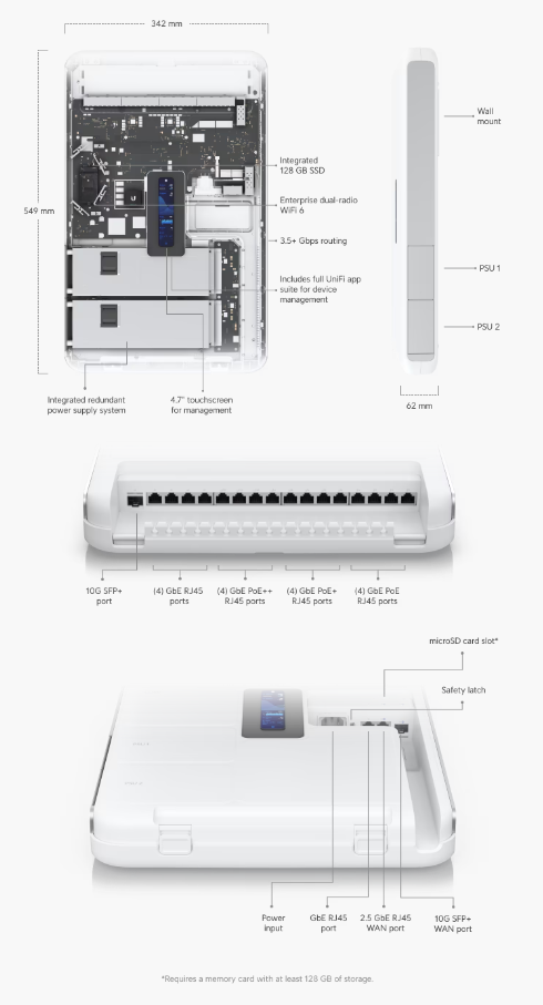 Ubiquiti UniFi Dream Wall je All-in-one jednotka, která v sobě ukrývá bránu s firewallem, Wi-Fi 6 access point, NVR a switch s funkcí PoE. Nabízí možnost připojení 10Gbps SFP+ portem nebo ethernetovým portem 2.5Gbps.Další informace