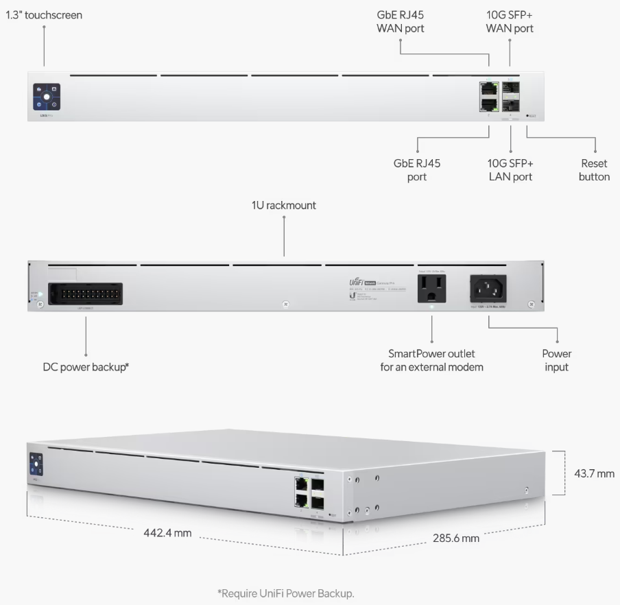 Ubiquiti UniFi Gateway Pro je bezpečnostní brána Dual-WAN vybavena 2 porty WAN (GbE RJ-45 a 10G SFP+), které zajišťují podporu převzetí služeb při selhání, a také 2 porty LAN (GbE RJ45 a 10G SFP+).Další informace