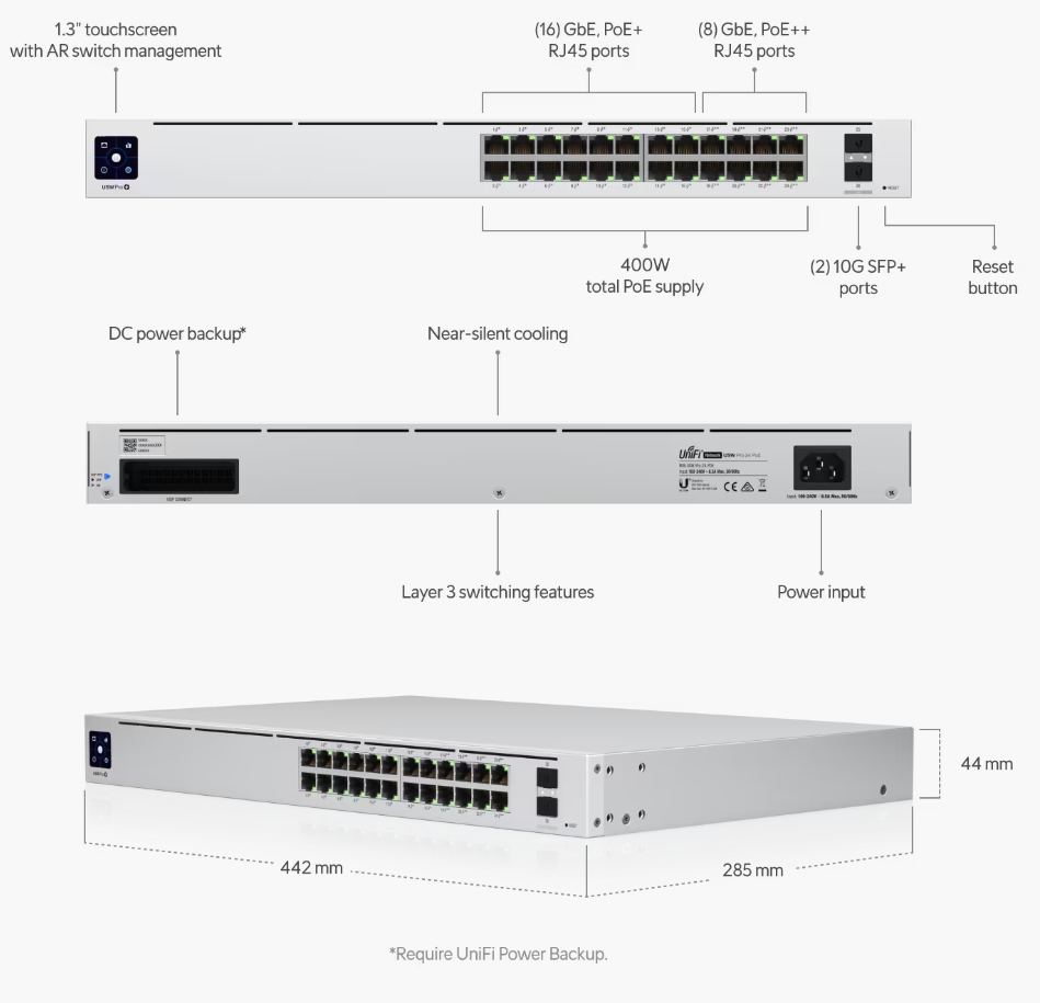 Ubiquiti UniFi Switch Pro 24 PoE má celkem 24 portů s funkcí POE-OUT. Porty 1-16 podporují standardy 802.3af/at, porty 17-24 pak 802.3bt (60 W). Celkový POE budget činí 400 W.Další informace