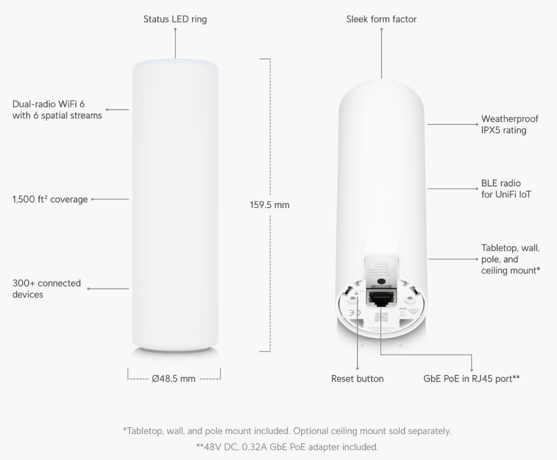 Díky krytí IPX5 je vhodný pro vnitřní i venkovní použití. Síťové řešení UniFi zajišťuje bezproblémovou integraci a správu. Zařízení podporuje napájení 802.3af PoE a šifrování WPA3.