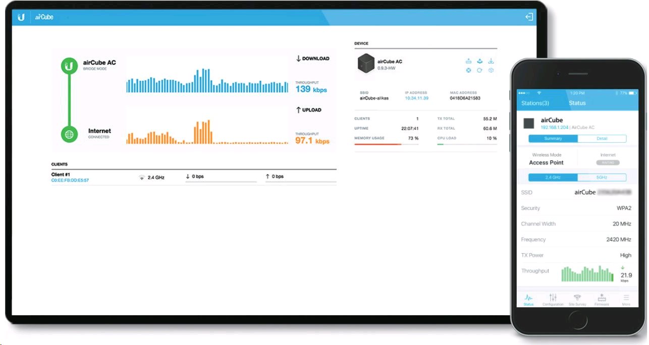 UBNT airCube ISP AP je domácí access point/router s velice výkonným a diskrétním anténním systémem. Router disponuje 3x 10/100 Mbps LAN (první LAN port podporuje PoE IN), 1x 10/100 Mbps LAN/WAN s podporou PoE Out.Další informace