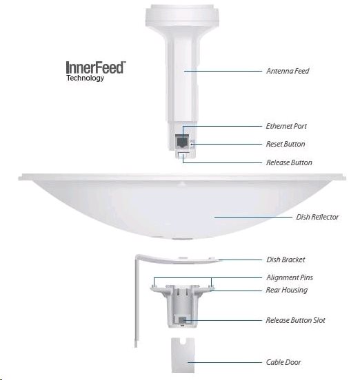 Součástí balení je i 24 V napájecí PoE zdroj, který obsahuje resetovací tlačítko pomocí kterého lze také jednotku uvést do TFTP módu pro obnovu firmwaru. Dodávka obsahuje jednu stranu spoje.