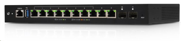 Ve výbavě routeru naleznete 10 metalických gigabitových portů a 2 SFP sloty pro možnost optické konektivity. Zařízení plně podporuje funkce L2, které lze nastavit v operačním systému EdgeOS nebo v aplikaci pro centrální správu - Ubiquiti Management System (UNMS).