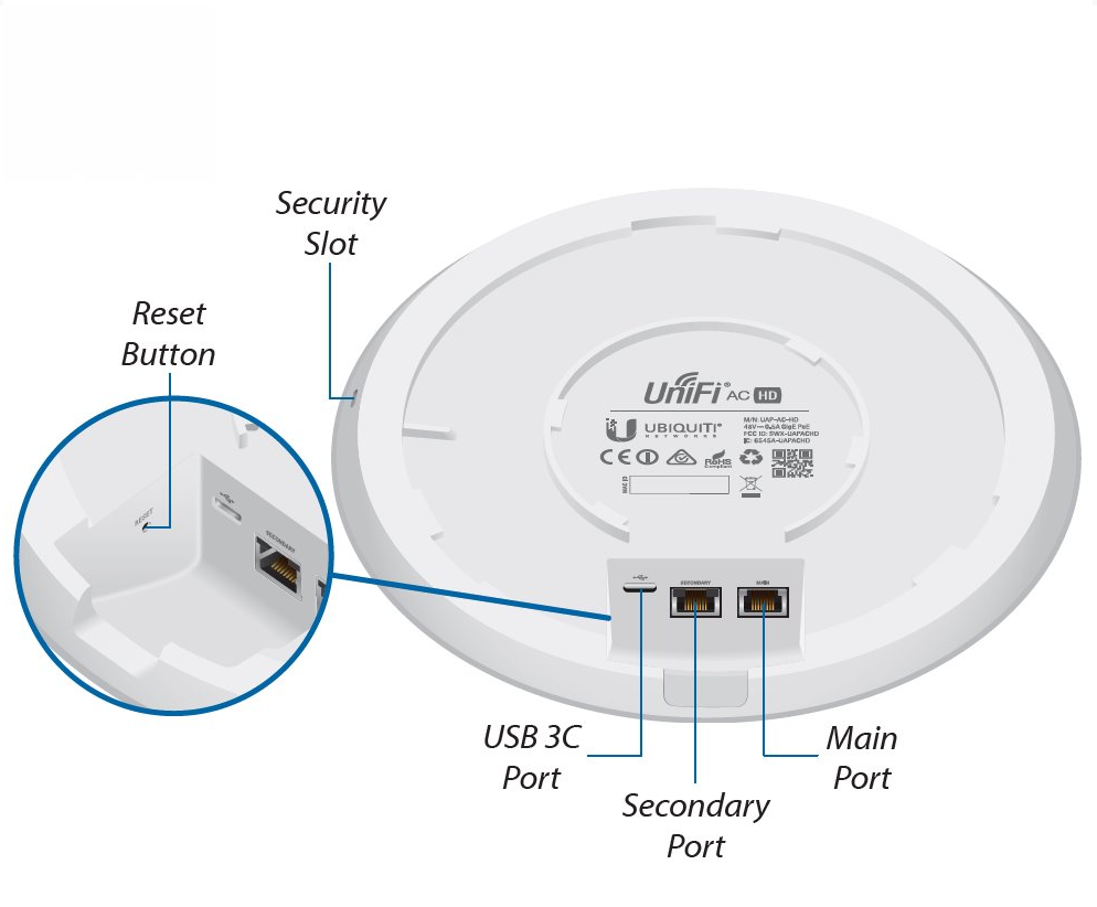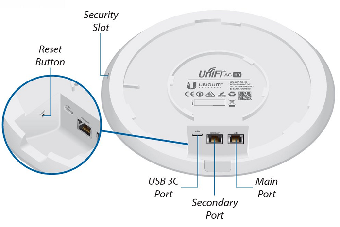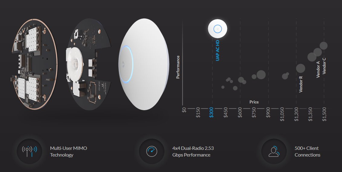 UniFi AC HD je hotspotové řešení využívající standardy 802.11a/b/g/n/ac/ac-wave2. Je vybaveno anténním systémem MIMO 4×4 v podobě integrovaných 3 dBi antén (2,4 GHz) a 4 dBi antén (5 GHz).