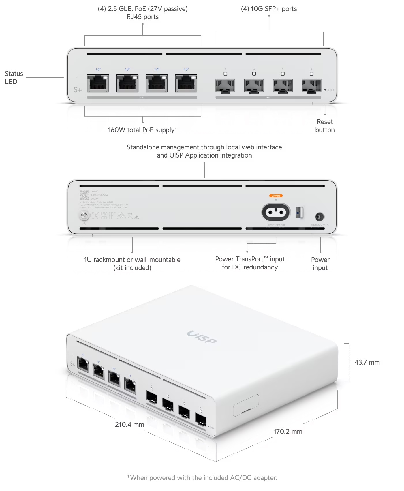 UBNT UISP Switch Plus je výkonný L2 PoE switch bez ventilátorů s 4x LAN porty (rychlost až 2,5 Gb/s) a 4x SFP+ porty (rychlost až 10 Gb/s. Celkový PoE budget je 160 W.Další informace