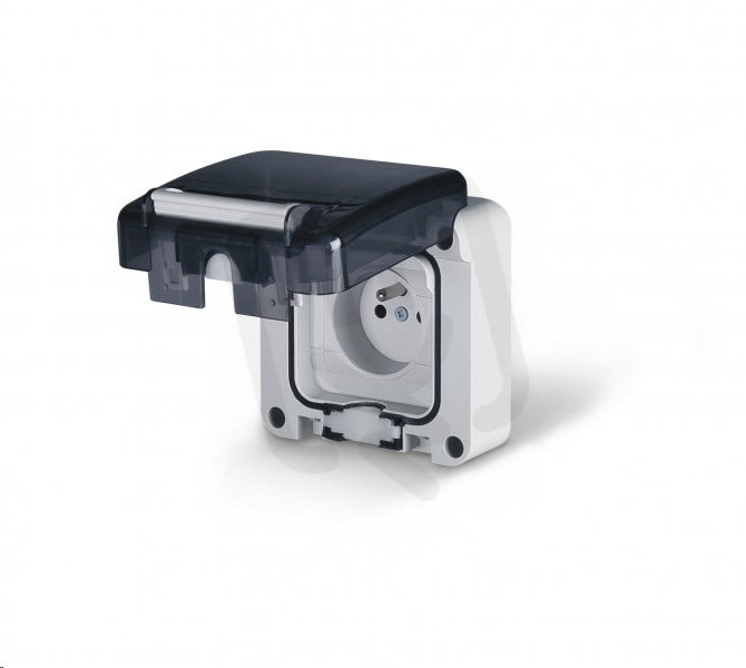 Vodotěsná a prachotěsná zásuvka pro použití v domácnostech a na podobné účely. Krytí IP66 zajišťuje speciální gelové těsnění i se zasunutou úhlovou vidlicí.