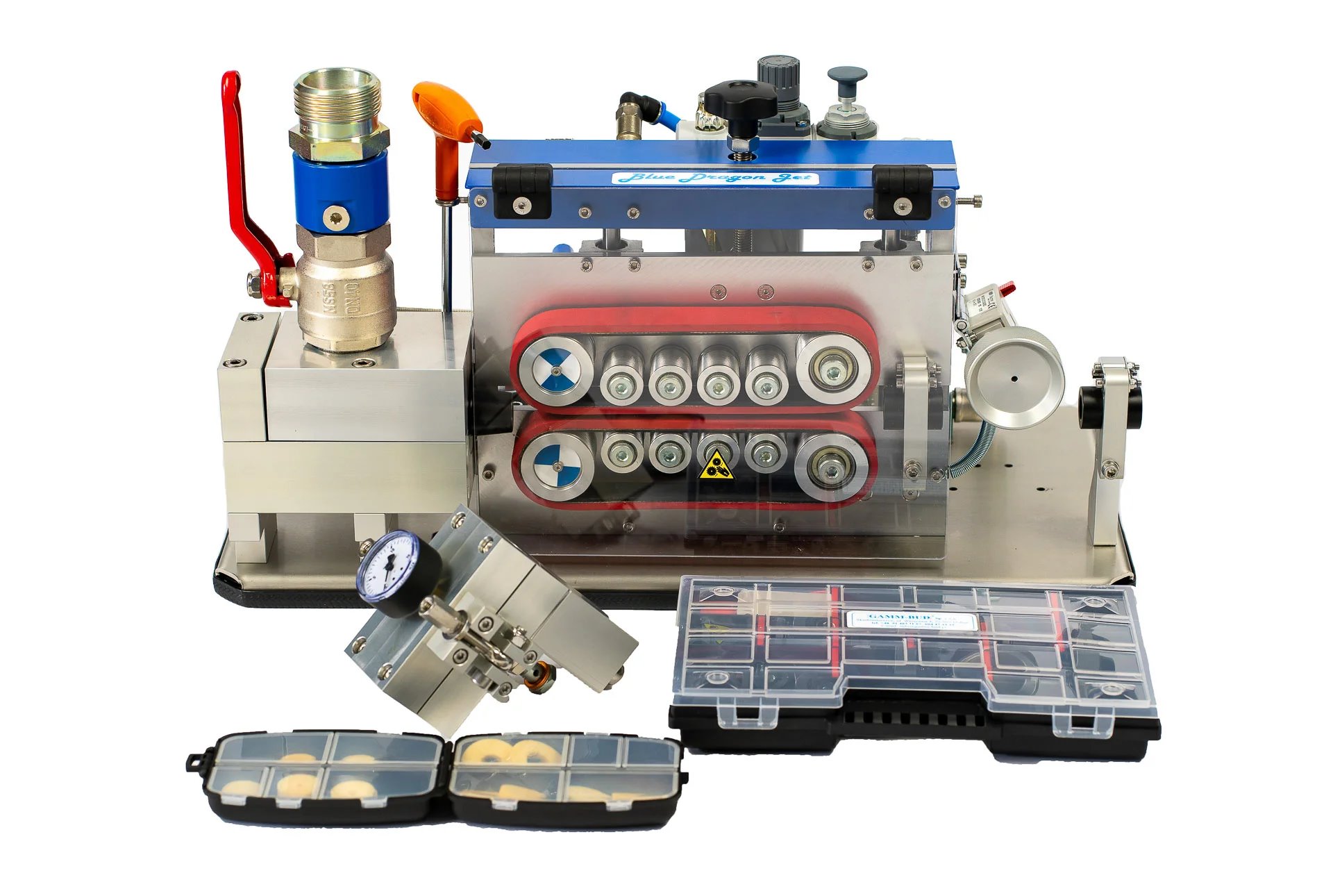 Zafukovačka Blue Dragon Jet MAX DUAL HEAD je všestranné pásové zařízení s pneumatickým pohonem určené k zafukování kabelů a mikrotrubiček do HDPE trubek i kabelů do mikrotrubiček. Díky své jednoduché a robustní konstrukci je velmi snadno ovladatelná při zachování dlouhé životnosti. Stroj je s dodávaným příslušenstvím zafukovat kabely/trubičky o průměrech 6 - 15 mm do HDPE trubek 32, 40 a 50 mm a optické kabely 4 - 10 mm do mikrotrubiček 5 - 16 mm. Konstrukce je uzpůsobena pro možnost vyjmutí neukončeného kabelu. Zafukovačka je vybavena praktickým mechanickým počítadlem, které umožní odečítat délku zafukovaného kabelu.