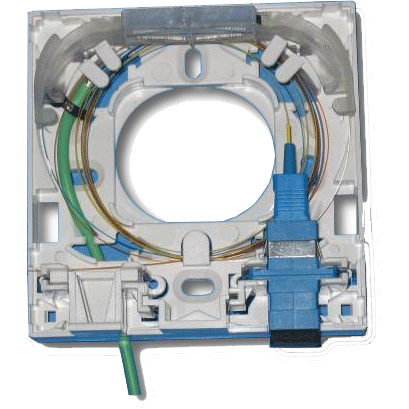 Zásuvka se dodává s 3 krytkami na SC pozice, krytkou na keystone. Zásuvka má malé rozměry (jako běžná el. zásuvka) a obsahuje organizér vláken a držáček ochran svárů případně spojek Fibrlok.
