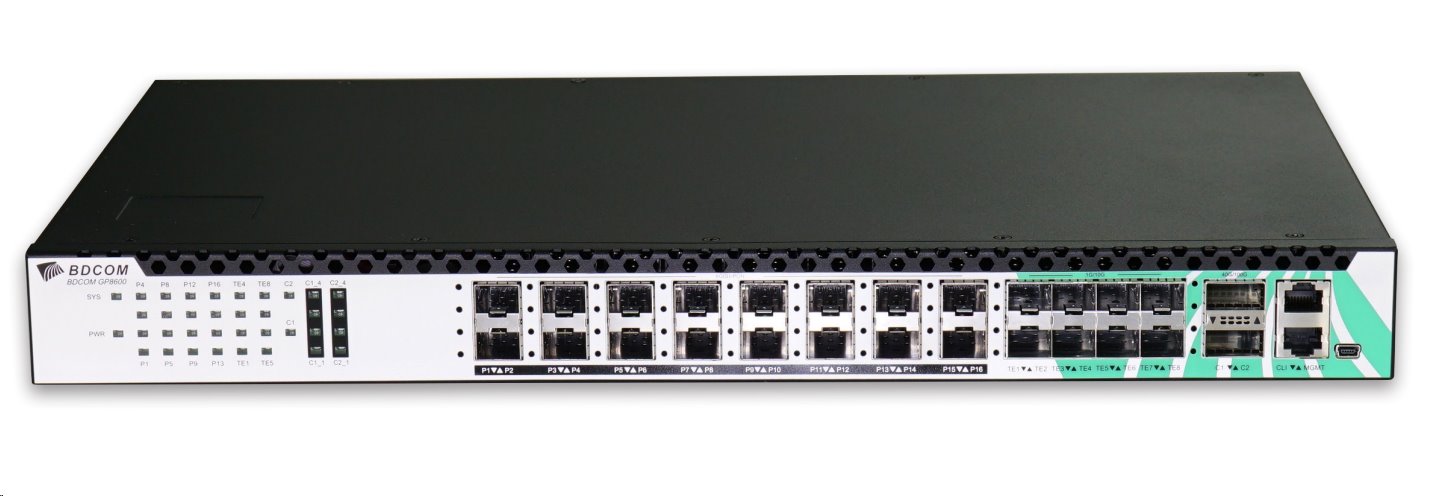 BDCOM GP8600-16 je kompaktní XGSGPON OLT od jednoho z největších světových výrobců síťových prvků. Toto OLT je vybaveno 16x XGSGPON porty, 2x 100G QSFP28 porty, 8x SFP+ porty, 1x konzolovým portem a 1x out-band portem.Další informace