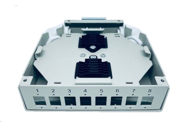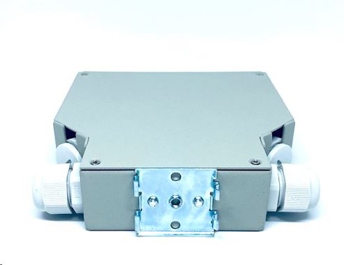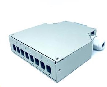 Optický rozvaděč/box pro umístnění na DIN lištu šedé barvy pro max. 8 SC simplex spojek, kovový se šroubovatelným víkem pro zakončení max. 12 optických vláken. Box má 4 kabelové vstupy a dodává se se 2 kabelovými průchodkami PG11 a dvěma záslepkami. Neosazen spojkami.