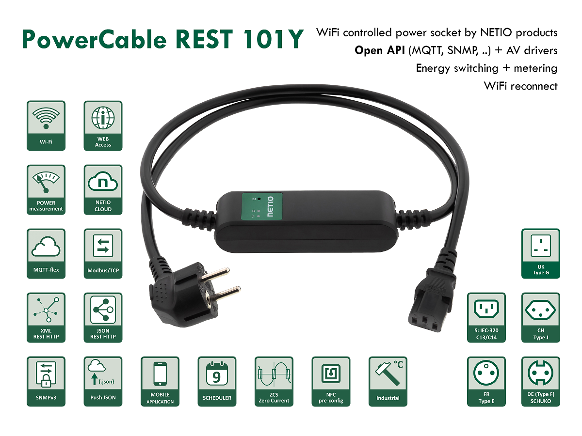NETIO PowerCable REST 101Y je WiFi zásuvka pro integraci do systému třetích stran pomocí otevřeného API. PowerCable je chytrá zásuvka v provedení jako elektrická připojovací šňůra s WiFi připojením do LAN sítě. Přes web rozhraní lze zobrazit hodnoty měření spotřeby elektřiny a zapnout / vypnout výstupní elektrickou zásuvku.