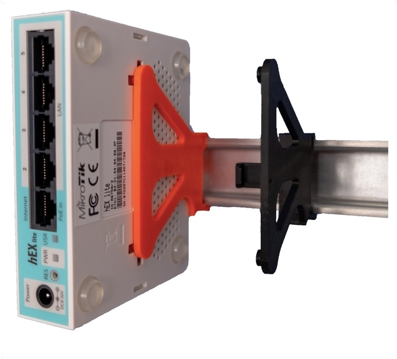 Držák na DIN lištu pro Mikrotik série hEX a hAP (porty dopředu), v2