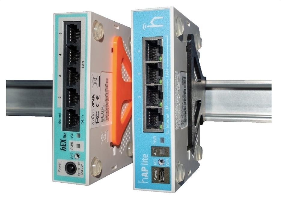 Plastový držák na DIN lištu umožňující vertikální uchycení Mikrotik aktivních prvků série hAP a hEX na DIN lištu, toto provedení umožňuje montáž porty směrujícími kolmo dopředu.Další informace