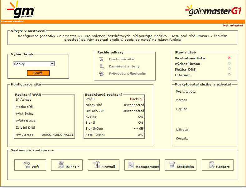 Konfigurace G1 probíhá přes webové rozhraní, které je přehledné a snadno pochopitelné. Zde je možno nalézt několik inovativních funkcí. Za všechny jmenujme možnost nastavení a uložení 3 profilů - master, backup1, backup2. Ty je pak možné nechat přepínat i automaticky kupř. v situaci, kdy je ztraceno spojení s AP. Další skvělou funkcí je snadné zaměření antény pomocí grafických indikátorů síly signálu se zapamatováním nejepší hodnoty. Perličkou na dortu je dvoujazyčné provedení - lze přepínat mezi ČJ a ANJ a nápověda je u každé funkce.