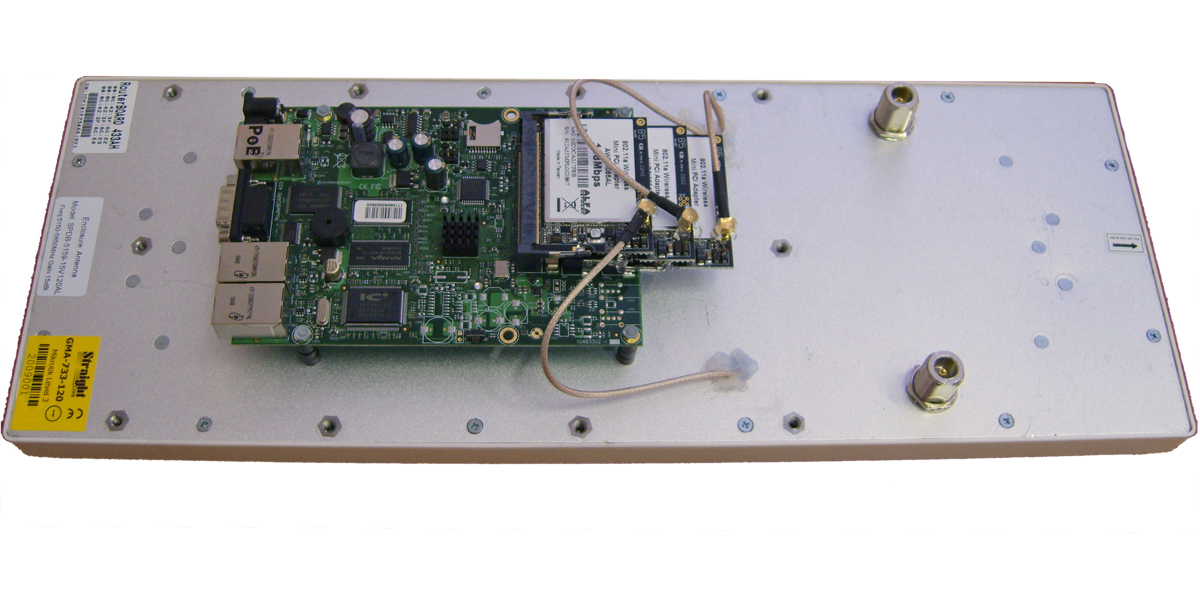 Kompletní jednotka s integrovanou 17 dBi sektorovou anténou (90°) využívající RB433AH a (s 3xMiniPCI porty připavenými k osazení).