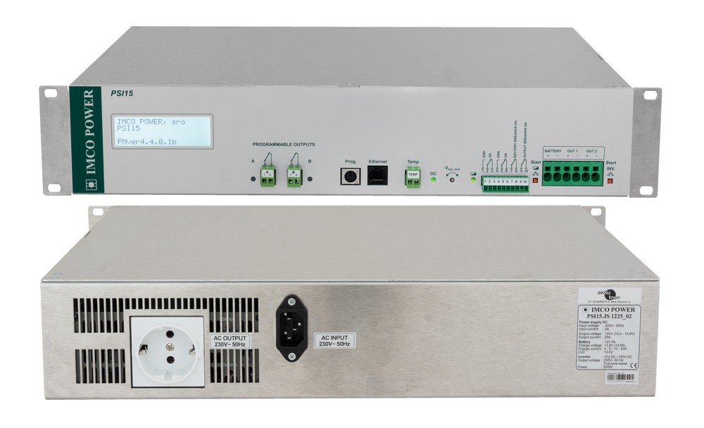 The IMCO POWER PSI15.JS 4815(2409)_04 is an unique device for power backup. It has 24 VDC and 48 VDC output, but also includes an inverter module that produces pure sine 230 V / 50 Hz / 200VA.Další informace