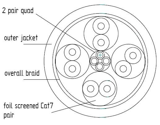 Kabel cat.7 S/FTP s UV cháněním do venkovního prostředí. Kabel odpovídá normě IEC 61156-5 Cat.7 a je sestaven ze čtyř individuálně stíněných párů a dvou přídavných kroucených párů - vše dohromady stíněné opletením a kryté PVC pláštěm odolným UV záření se samozhášivým účinkem.