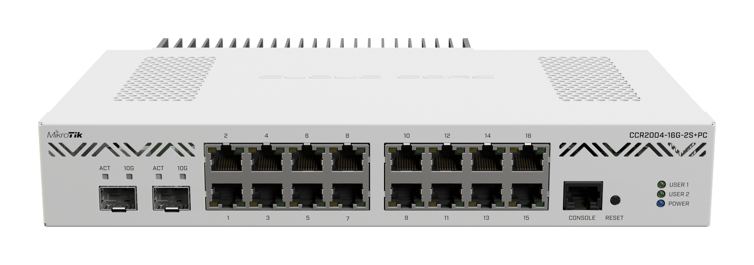 MikroTik CCR2004-16G-2S+PC je pokročilý router, který nabízí celkem 18 portů, z toho 16x GE RJ45 a 2x 10G SFP+, navíc je zcela pasivně chlazený.Další informace