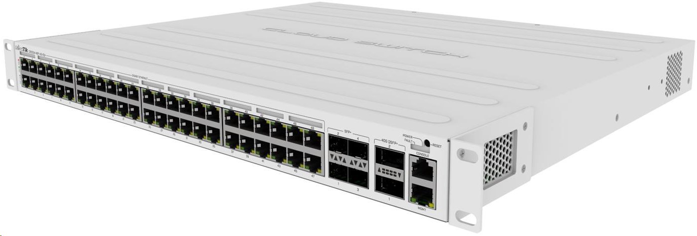 MikroTik Cloud Router Switch CRS354-48P-4S+2Q+RM je výbavou nadupaný switch s 2x QSFP+, 4x SFP+, 48x Gigabitových ethernetů a jedním 10/100Mbps metalickým portem určený pouze pro management. Switch tak poskytuje celkovou propustnost 168 Gbps a přepínací kapacitu 336 Gbps s rychlostí přeposílání 235 Mpps u většiny běžných paketů.