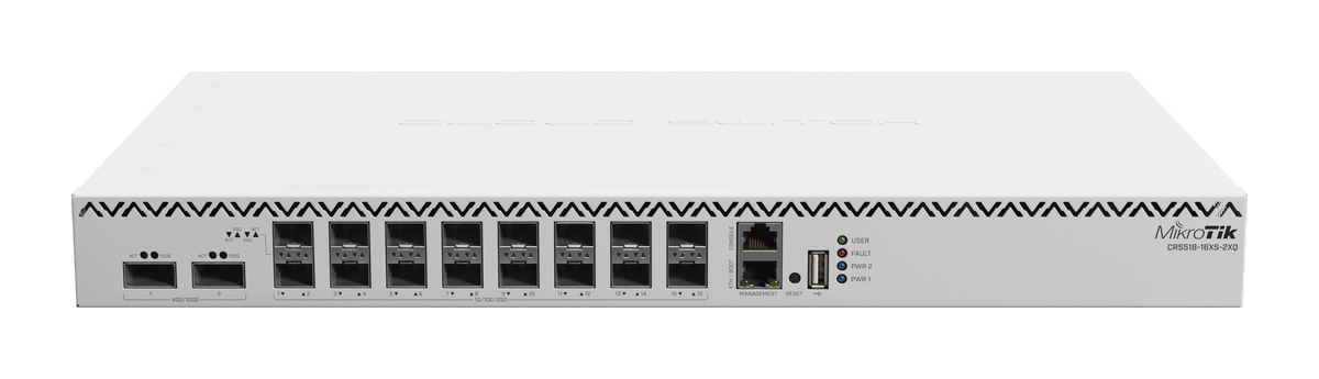 MikroTik Cloud Router Switch CRS518-16XS-2XQ-RM je plně managovatelný optický switch, který disponuje 2x 100 Gbps QSFP28 porty, 16x 25 Gbps SFP28 porty a 1x metalickým portem pro management.Další informace