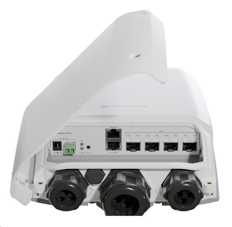 MikroTik Fiber Box Pro je venkovní 10gigabitový optický switch, který nabízí 4x SFP+ šachtu, 1x GE RJ45 port s podporou PoE-in a navíc ještě další dva způsoby napájení - 2pin svorkovnici a klasický jack.Další informace