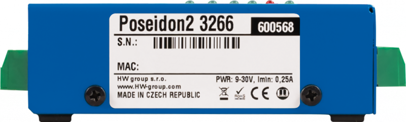Poseidon2 3266 Teplotní set obsahuje vše potřebné pro instalaci a zahájení dohledu a měření. Poseidon2 3266 měří teplotu, vlhkost , stavy kontaktů (DI vstupy) a jiných externích senzorů, odešle email při hodnotě mimo rozsah. Poseidon2 3266 lze připojit do systému pro monitoring prostředí. Podporuje M2M protokoly SNMP v3, Modbus/TCP, XML a online aplikace HWPortal.cz.