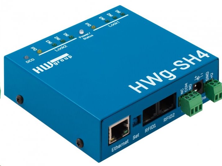 HWg-SH4 je autonomní přístupový systém pro otevírání dvou dveří (zámků). Dveře může oprávněná osoba otevřít pomocí RFID karty, nebo stisknutím tlačítka pro odchod zevnitř. Pro malé instalace lze databázi osob (karet) spravovat přes web rozhraní zařízení, SH4 odešle email / SMS při otevření zámku nebo při detekci násilného vniknutí.