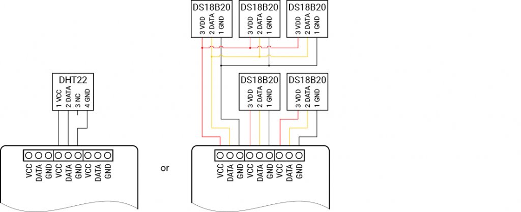 - Lze použít až s pěti senzory DS18B20 nebo jedním senzorem DHT22