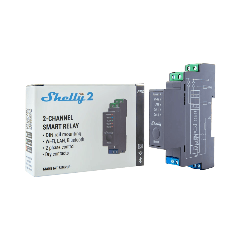 Shelly Pro 2 je 2kanálové relé podporující až 25 A (každý 16 A) pro profesionální automatizaci světel a spotřebičů v obytných nebo komerčních aplikacích. Je vybaven bezpotenciálovými výstupy (suché kontakty). Konektivita je řešena pomocí Wi-Fi (2.4GHz), LAN (RJ45) a Bluetooth. Shelly Pro 2 má skriptovací funkce (plná podpora mjS) pro vlastní automatizační scénáře založené na externích datech nebo různých událostech.