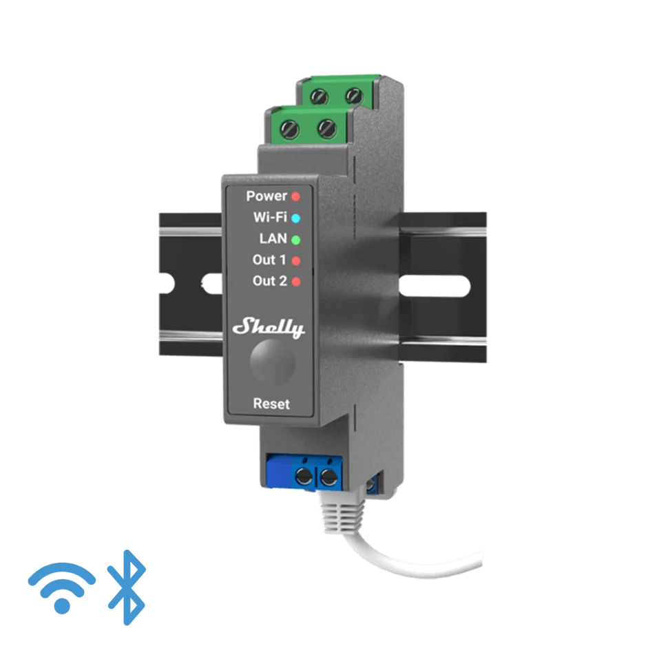 Shelly Pro 2 je 2kanálové relé podporující až 25 A (každý 16 A) pro profesionální automatizaci světel a spotřebičů v obytných nebo komerčních aplikacích. Je vybaven bezpotenciálovými výstupy (suché kontakty).Další informace