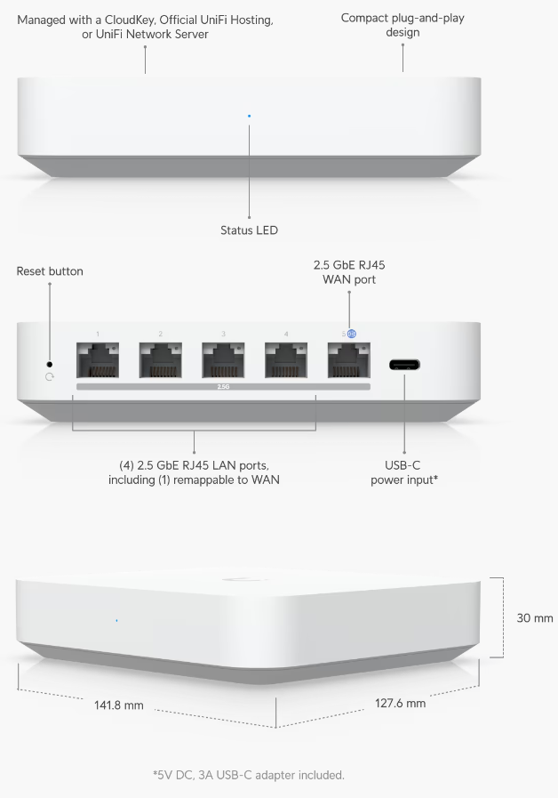 Jednotka je vybavena 1x portem WAN (2,5 GbE RJ-45) a 4x LAN (2,5 GbE RJ-45) porty, které zajišťují vysokorychlostní připojení potřebné pro podporu většiny aplikací náročných na šířku pásma. Vyniká také jako kompaktní řešení zabezpečení sítě, které nabízí kompletní sadu funkcí pro minimalizaci hrozeb, včetně systémů detekce a prevence narušení (IDS/IPS), filtrování obsahu a segmentace provozu na základě VLAN. Pro správu a využití všech možností nastavení je nutné UniFi routery UXG adaptovat do konzole UniFi Cloud Key Gen2/Gen2 Plus, UniFi Cloud Key Enterprise nebo do softwaru UniFi Network Server.