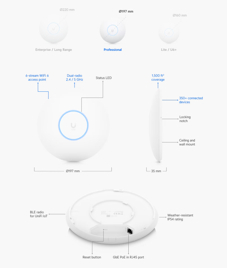 Ubiquiti UniFi U6 Pro je nejvyšším řešením z access pointů řady U6 s podporou WiFi 6 (802.11ax) . Dual-band radio se může pochlubit 4x4 MU-MIMO & OFDMA (5 GHz) s šířkou kanálu az 160 MHz a 4x4 MIMO v pásmu 2.4 GHz, dosahuje propustnosti až 5,3 Gbps.Další informace