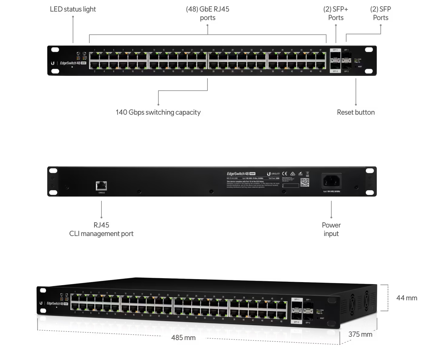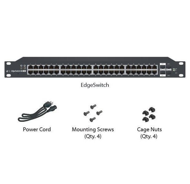 UBNT EdgeSwitch 48 PoE (500W) je Gigabitový L3 PoE switch v 19" rackmount provedení s maximálním výkonem PoE napájení 500 W. Managovatelný switch s 48 gigabit metalickými porty + 2 gigabitové SFP porty + 2 desetigigabitové SFP+ porty.Další informace